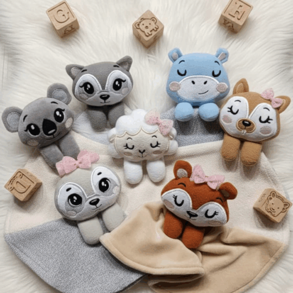 A coleção Safári Bouquet em Flor é composta por cinco matrizes exclusivas: elefanta, leoa, rinoceronte fêmea, hipopótamo fêmea e zebra fêmea, todas representadas em versões delicadas com flores, transmitindo suavidade, afeto e um visual encantador para o universo infantil.