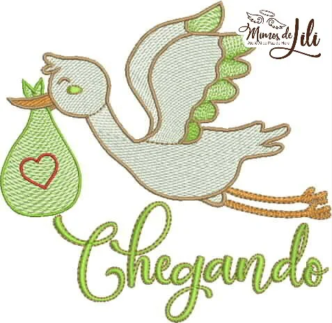 O saquinho que carrega o bebΓͺ e o detalhe das asas da cegonha sΓ£o em ponto rippled.