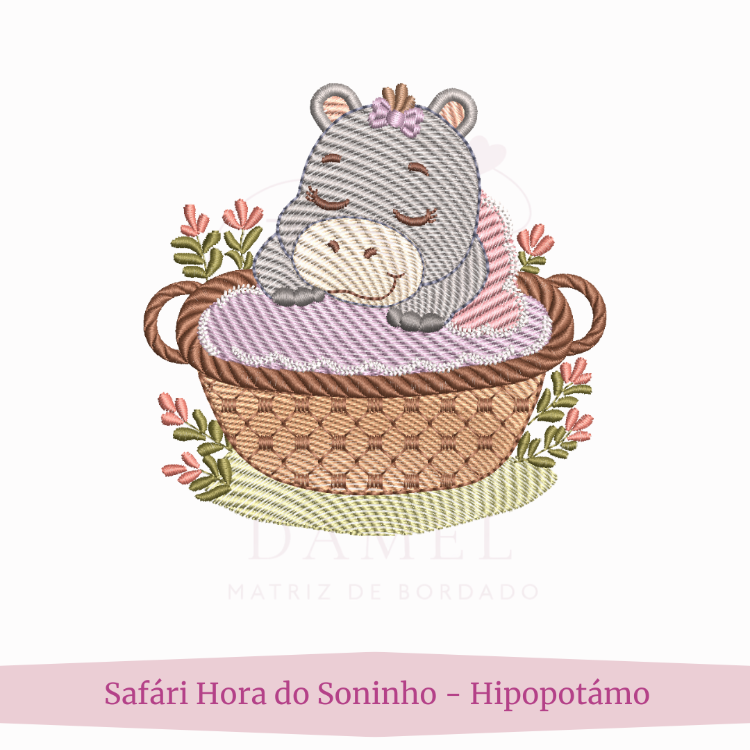 Matriz de Bordado Safári Hora do Soninho Hipopotámo Menina (Pontos Leves)