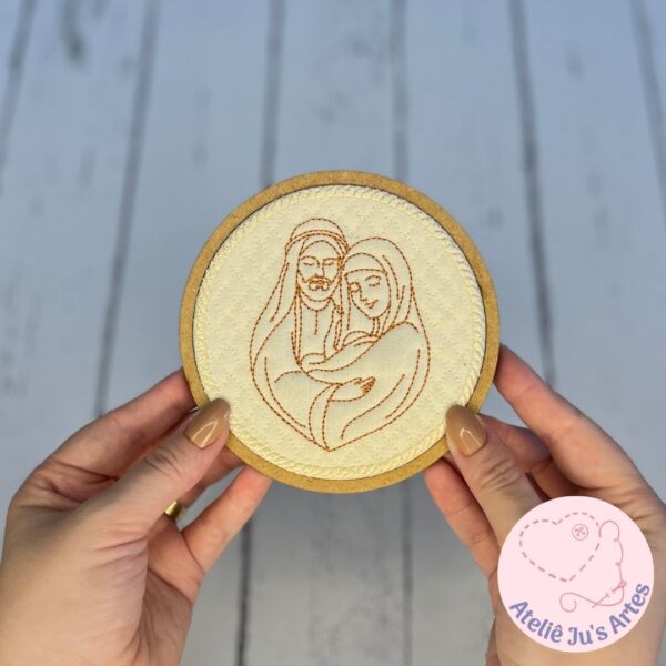 O preço original era: R$20,00.R$15,00O preço atual é: R$15,00.[Matrizes de Bordado] TAG Sagrada Família em Trapunto