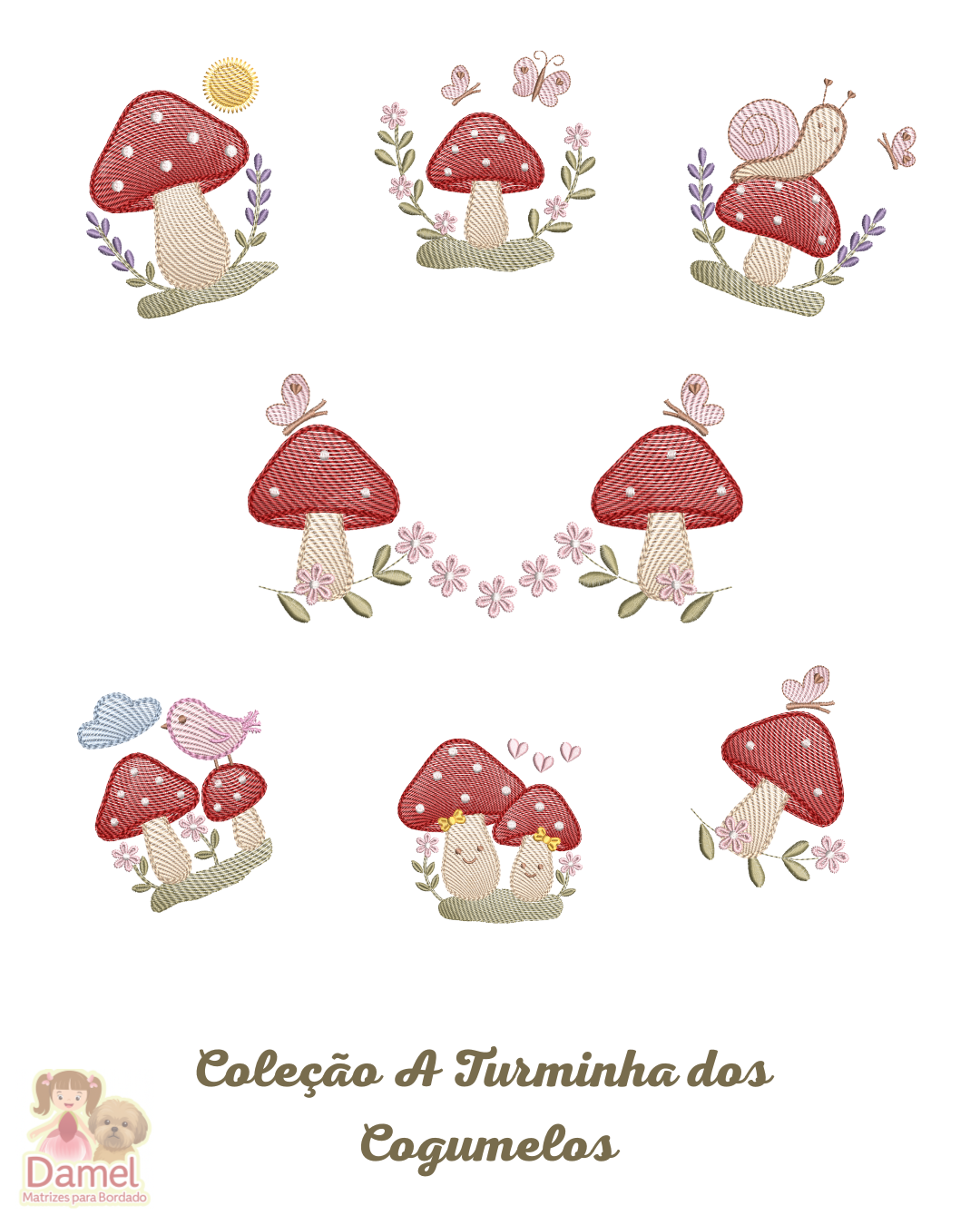 Coleção digital de matrizes de bordado com tema de cogumelos, pensada para compor kits coordenados (roupas infantis, enxoval, toalhas, necessaires, capas e decoração).