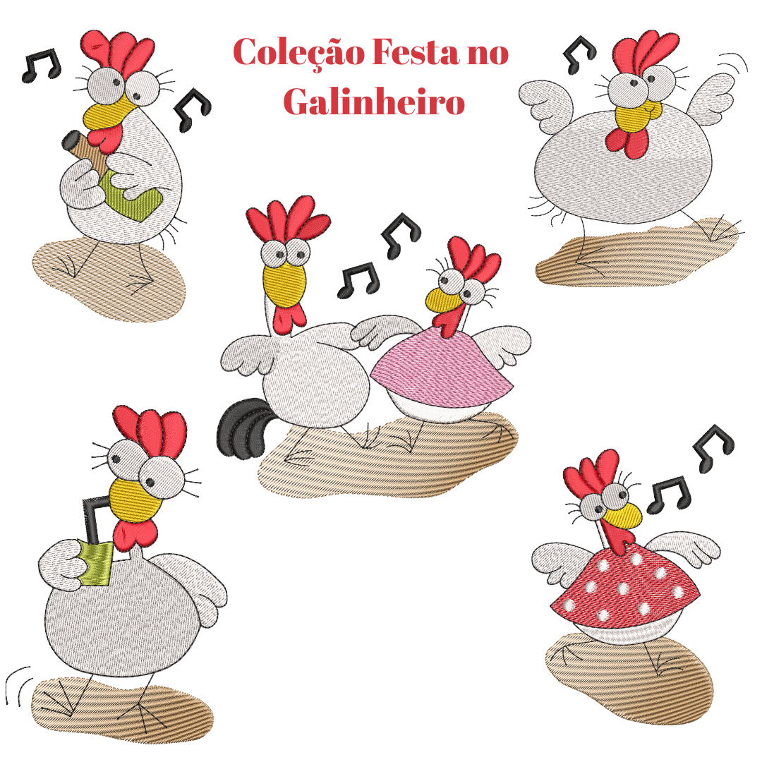 💕🐔🎶  A coleção Festa no Galinheiro apresenta um conjunto encantador de galinhas cheias de ritmo, movimento e expressões divertidas. Cada matriz foi criada com traços leves, toque cômico e detalhes que remetem à alegria da vida no galinheiro — perfeitas para quem ama bordados cheios de personalidade.