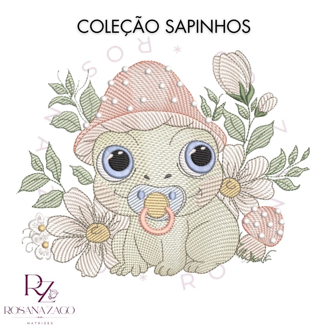 Coleção de matrizes de bordado em pontos leves com motivos infantis de sapinho. Ideal para bordar em enxovais de bebês.