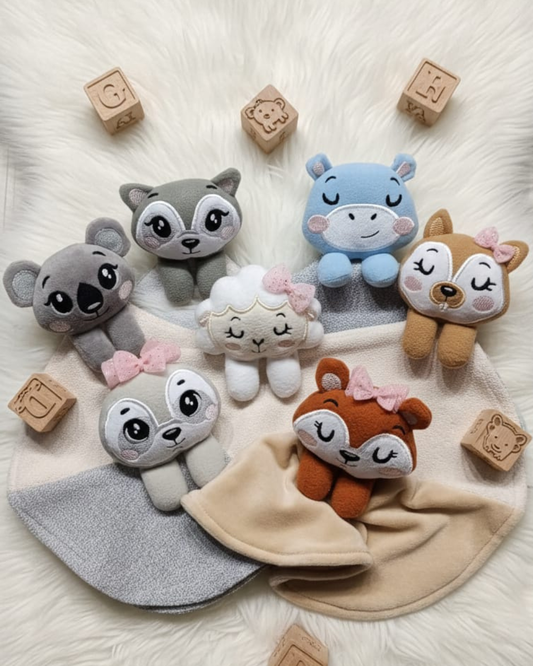 Ovelha, Esquilo, Hipopótamo, Lobinho, Coala, Preguiça, Sapinho — também com versões menino e menina.