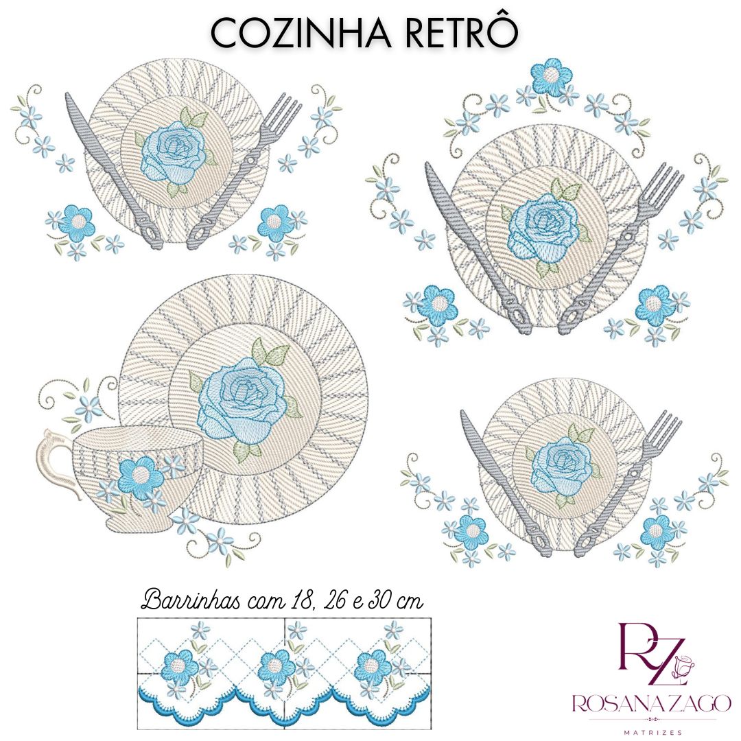 TEMA COZINHA RETRÔ. Ideal para bordar em peças de ENXOVAL DE COZINHA: panos de prato e bate-mão, toalhas de chá e de mesa, cobre bolos, lugar americano, trilho de mesa…