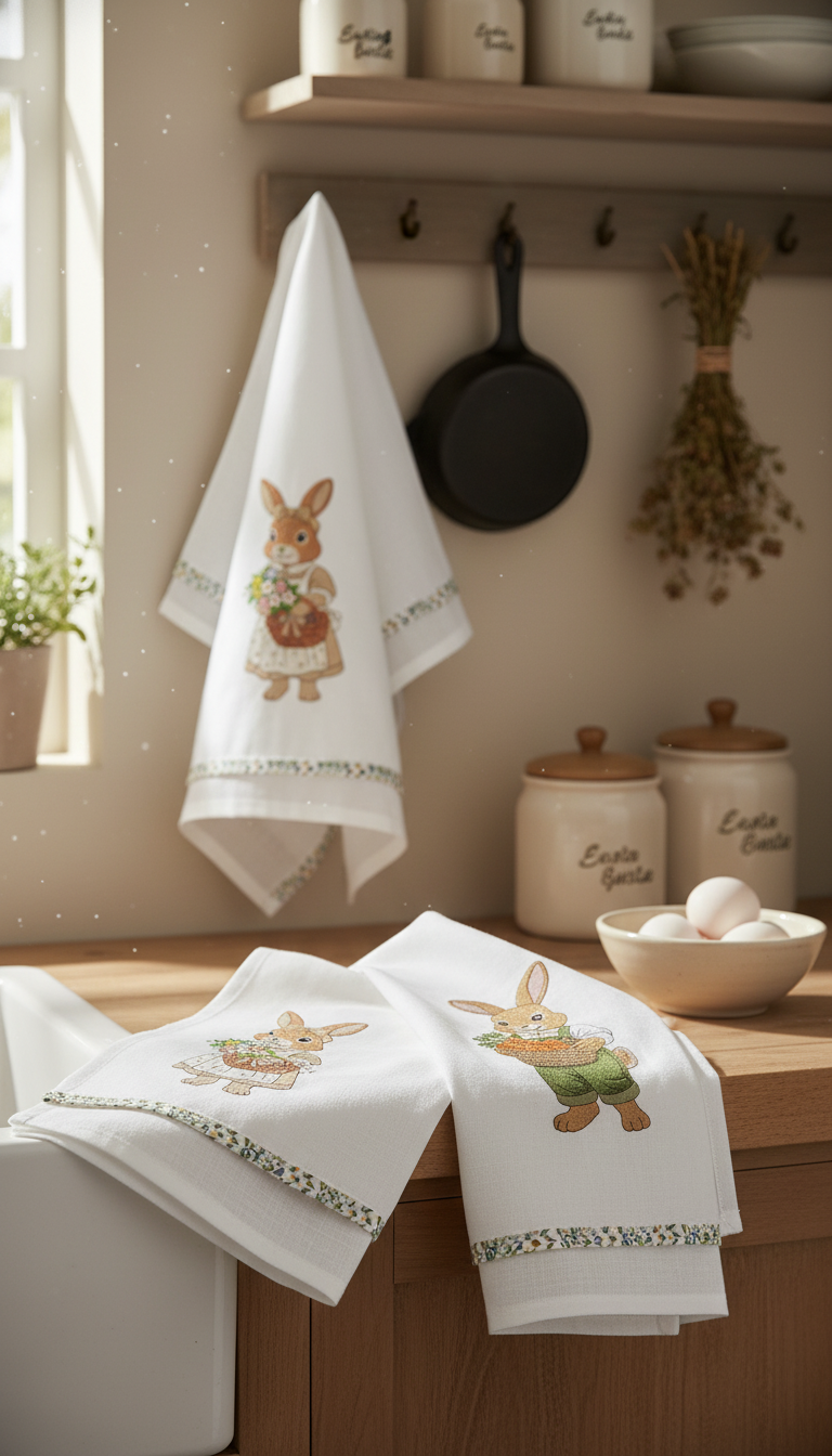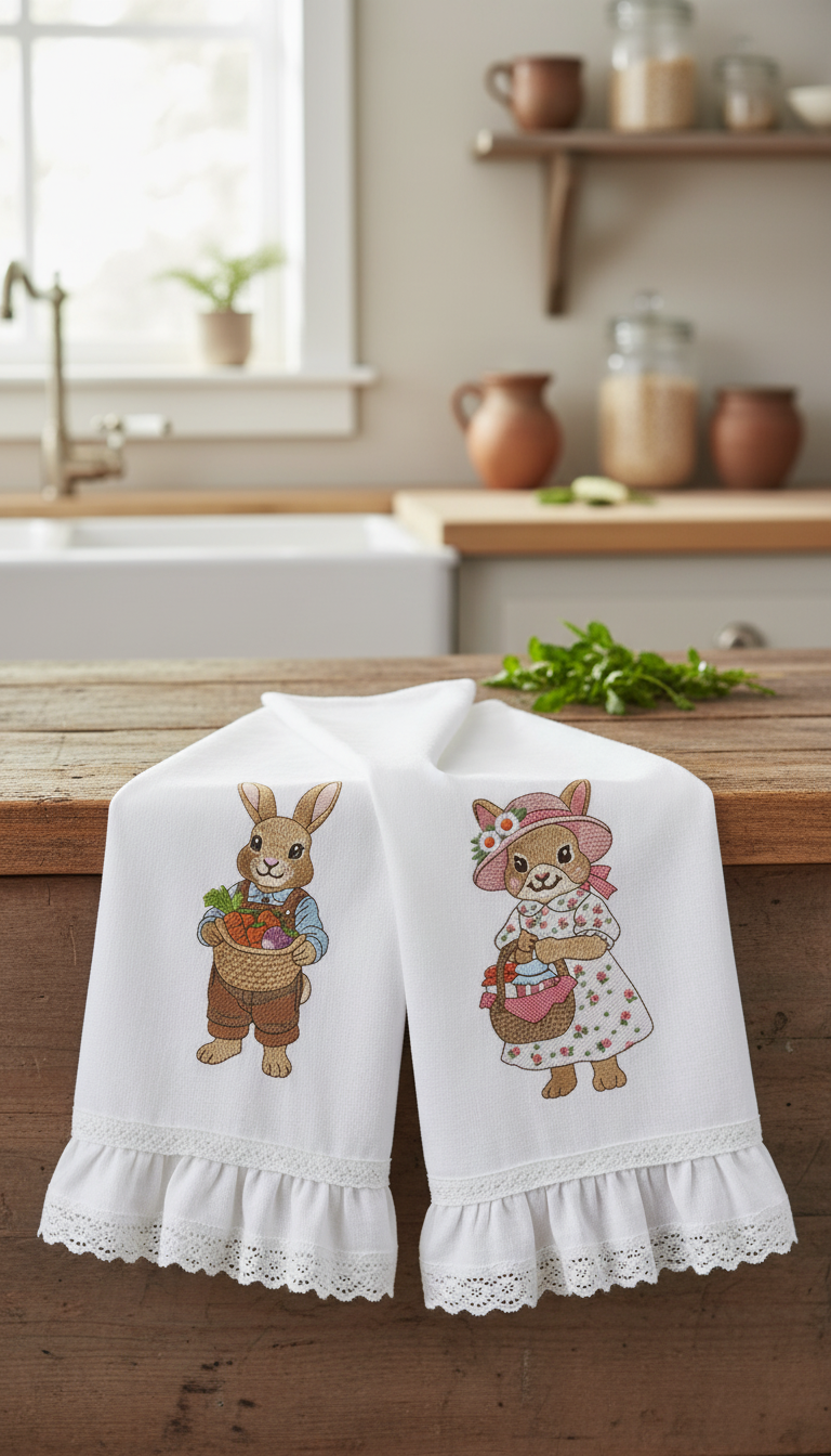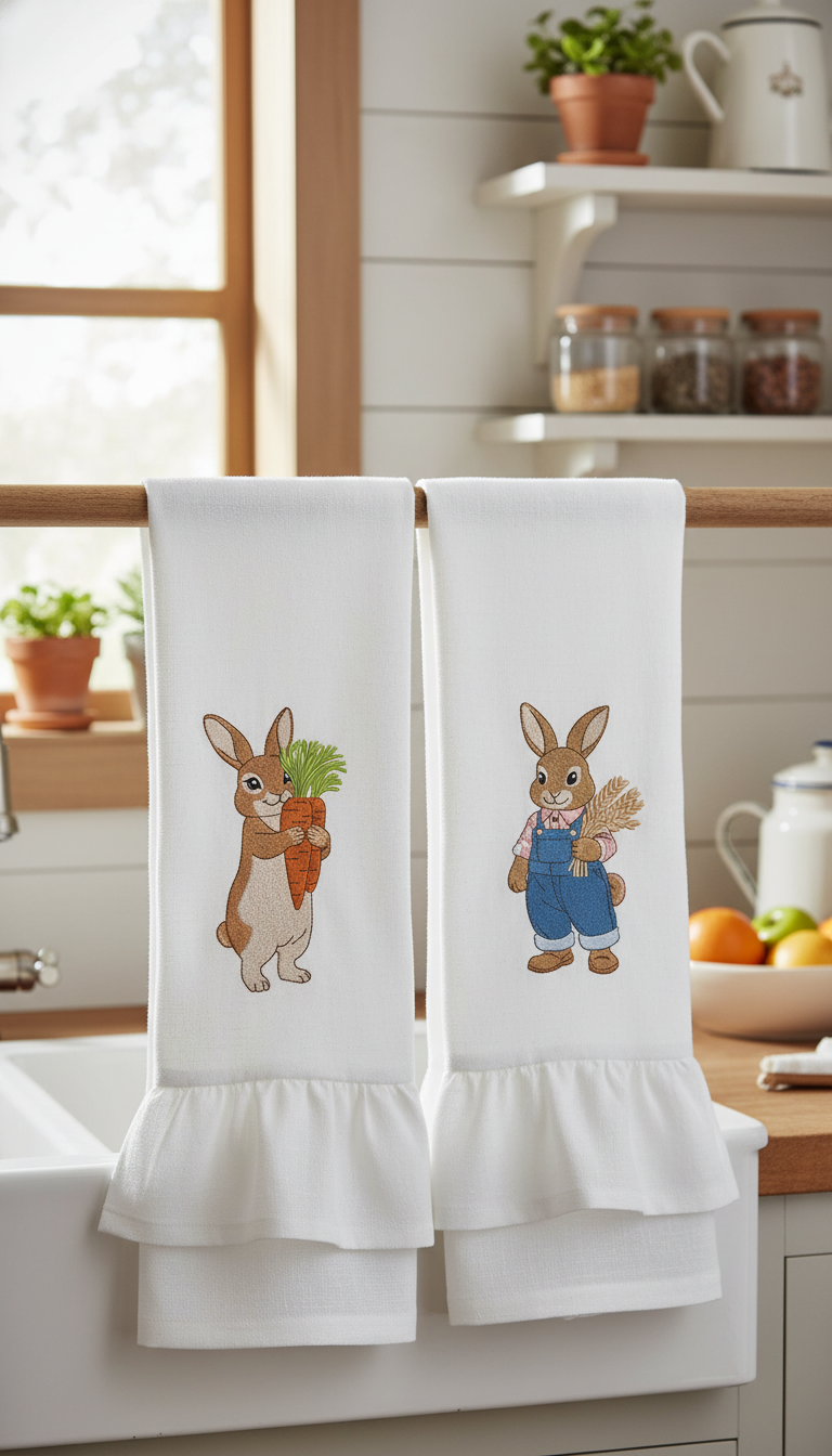 O design pode ser bordado em toalhas de cozinha, guardanapos, aventais, toalhas de mesa e assim por diante, em camisetas e decoração têxtil para o lar.