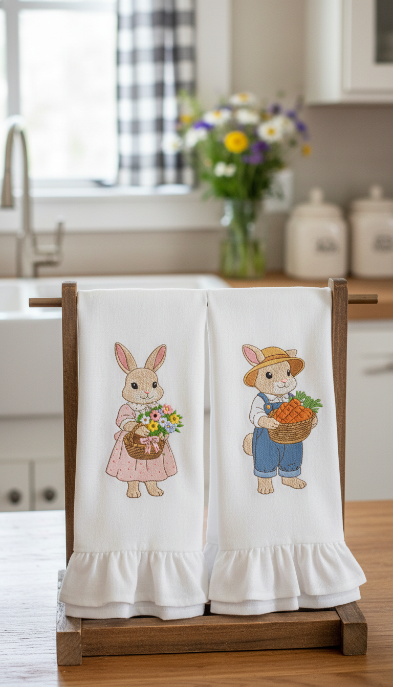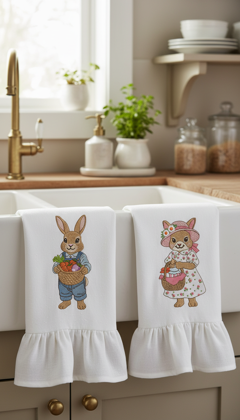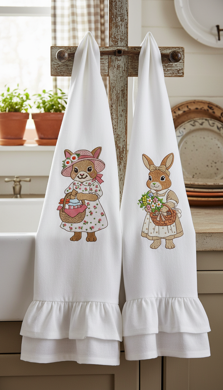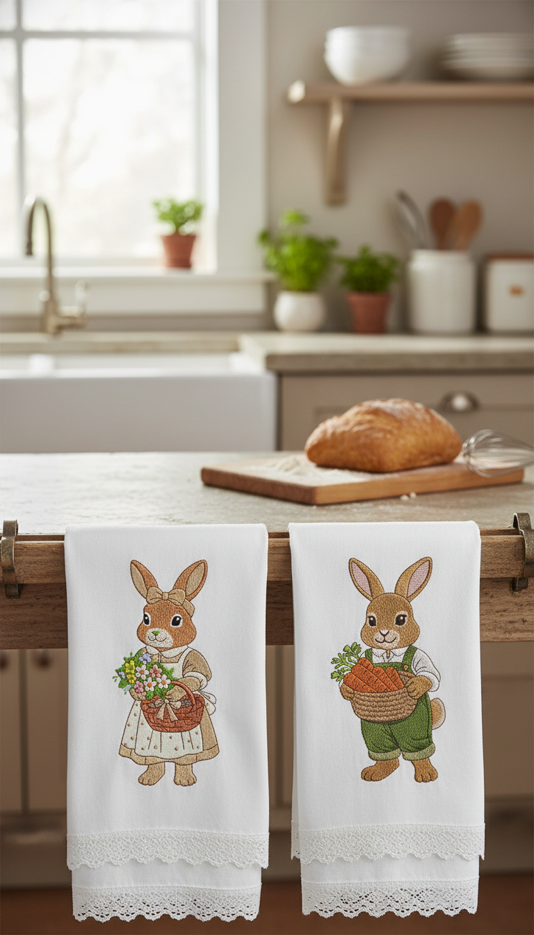O design pode ser bordado em toalhas de cozinha, guardanapos, aventais, toalhas de mesa e assim por diante, em camisetas e decoração têxtil para o lar.
