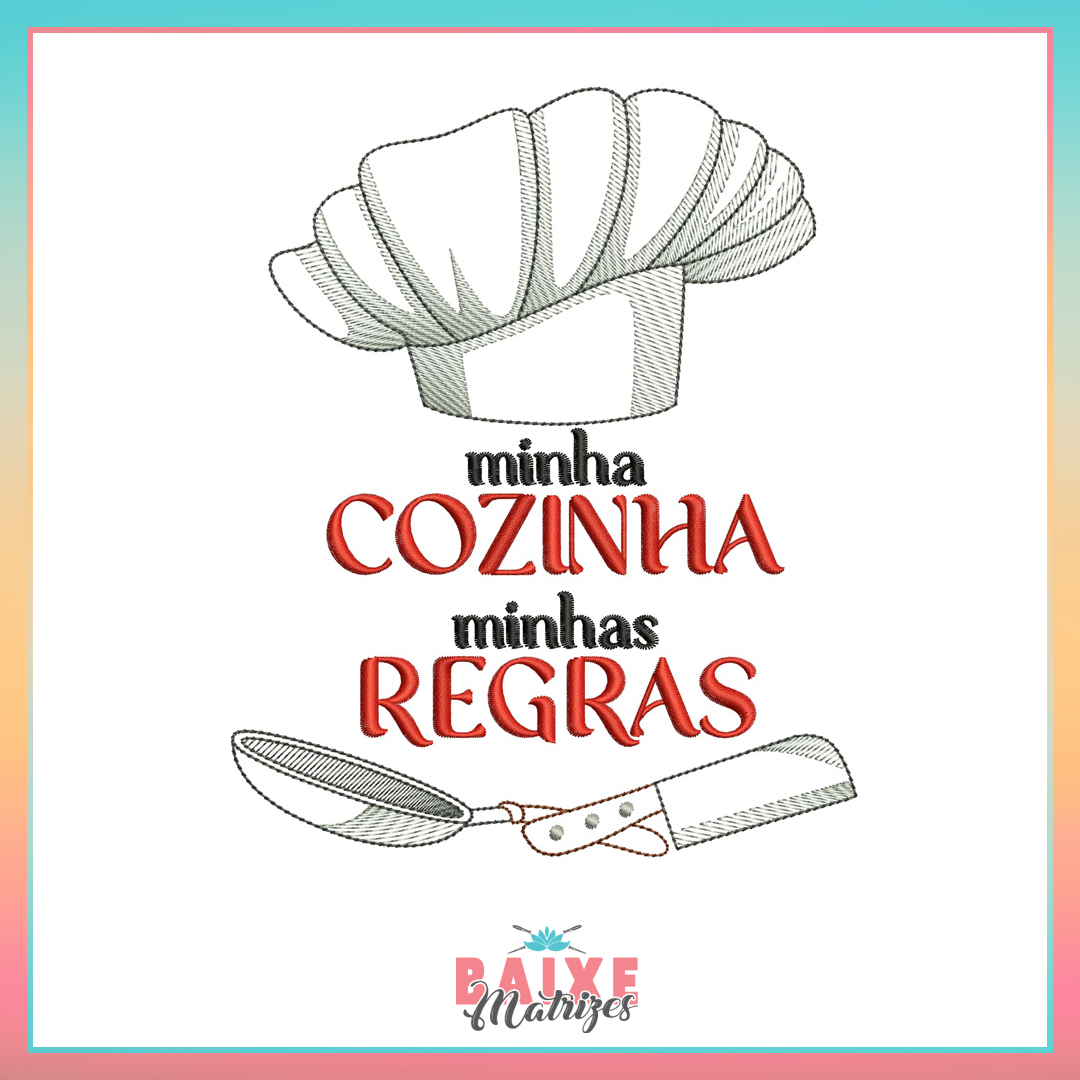 Ao efetuar o download da Matriz de Bordado Minha Cozinha Minhas Regras da Baixe Matrizes, vocรช receberรก um arquivo em .zip que contรฉm a matriz nos formatos .PES e .JEF