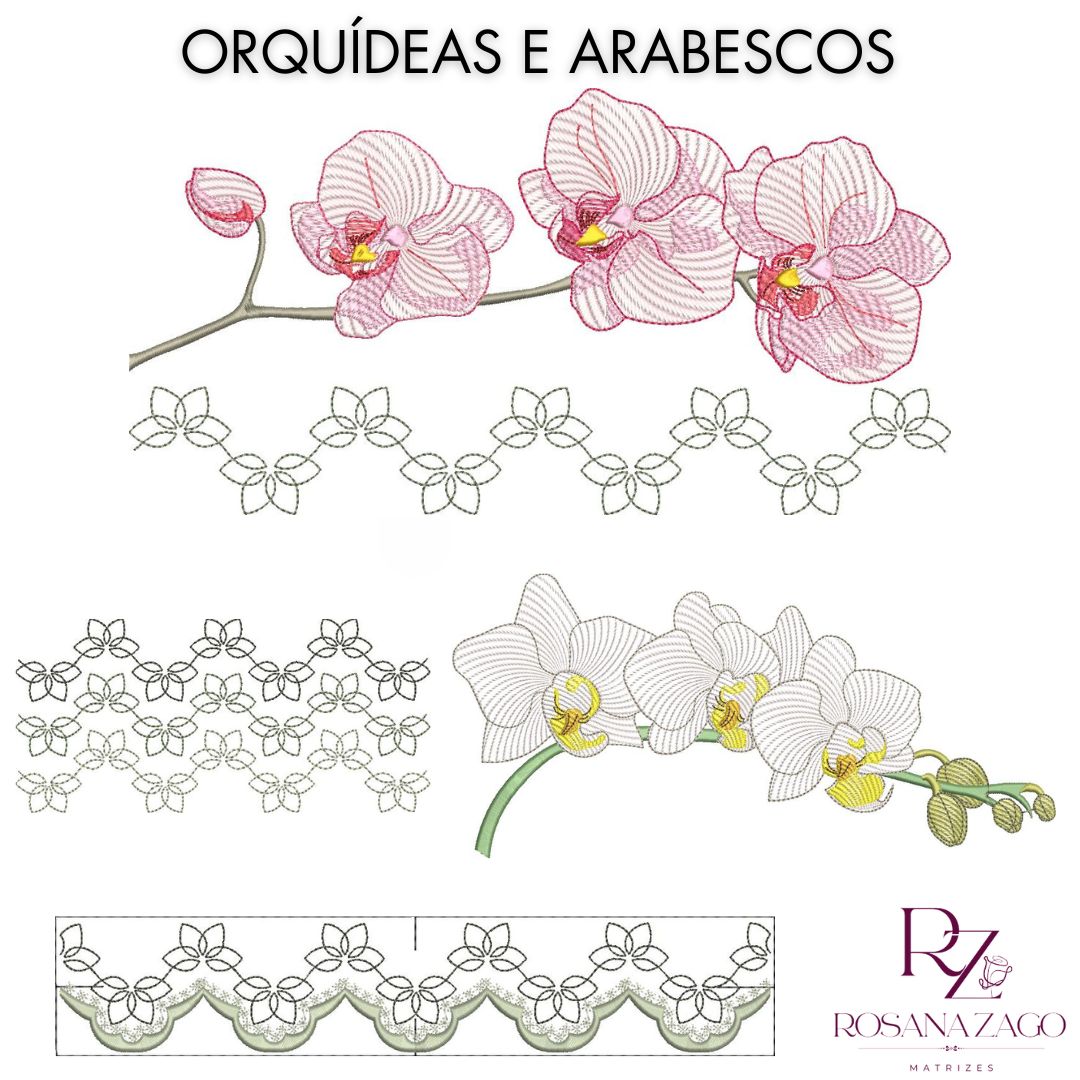 TEMA ORQUÍDEAS e ARABESCOS. Ideal para bordar em peças de ENXOVAL DE DE COZINHA: panos de prato e bate-mão, toalhas de chá e de mesa, cobre bolos, lugar americano, trilho de mesa, TOALHAS BANHO, ROSTO e LAVABO, roupas de cama…