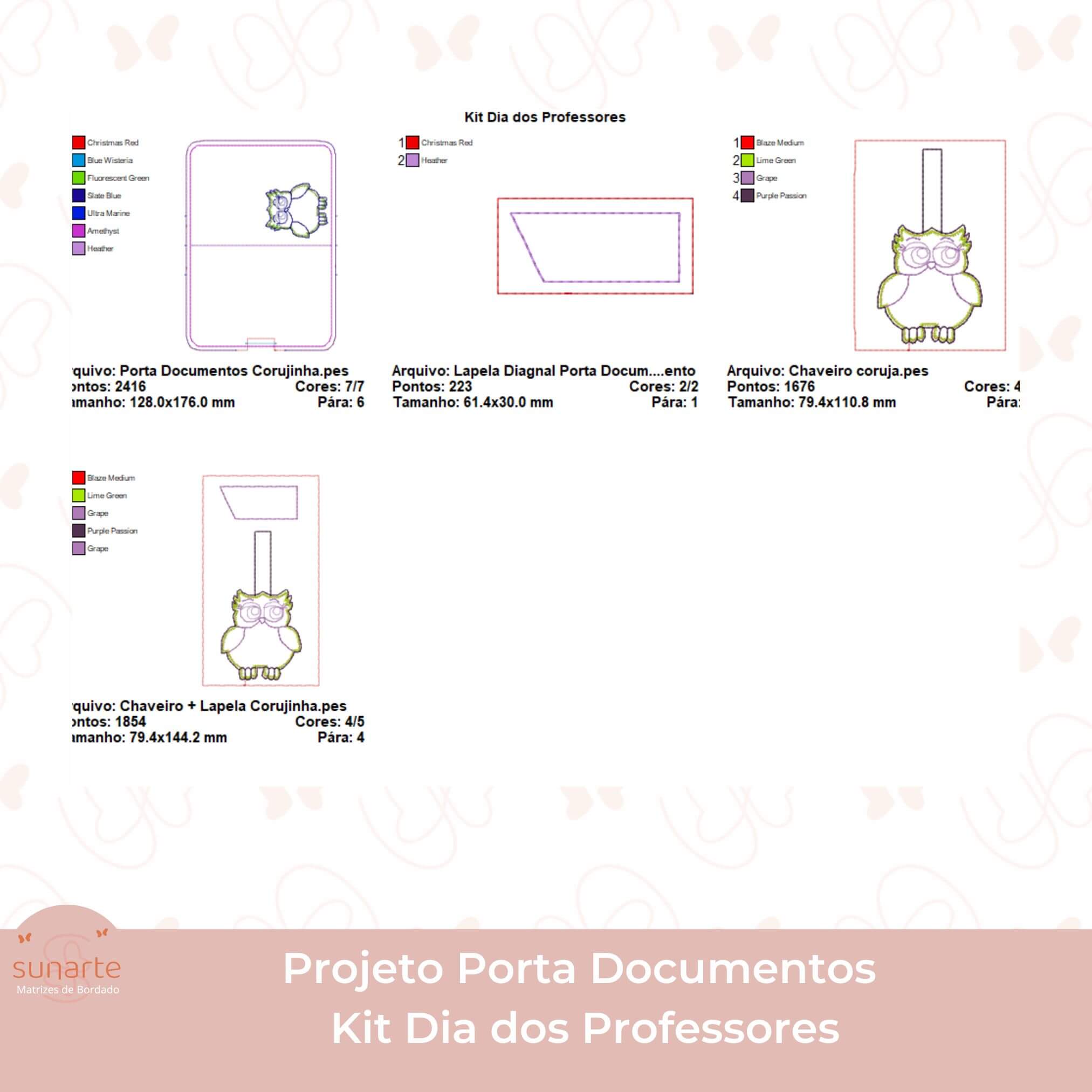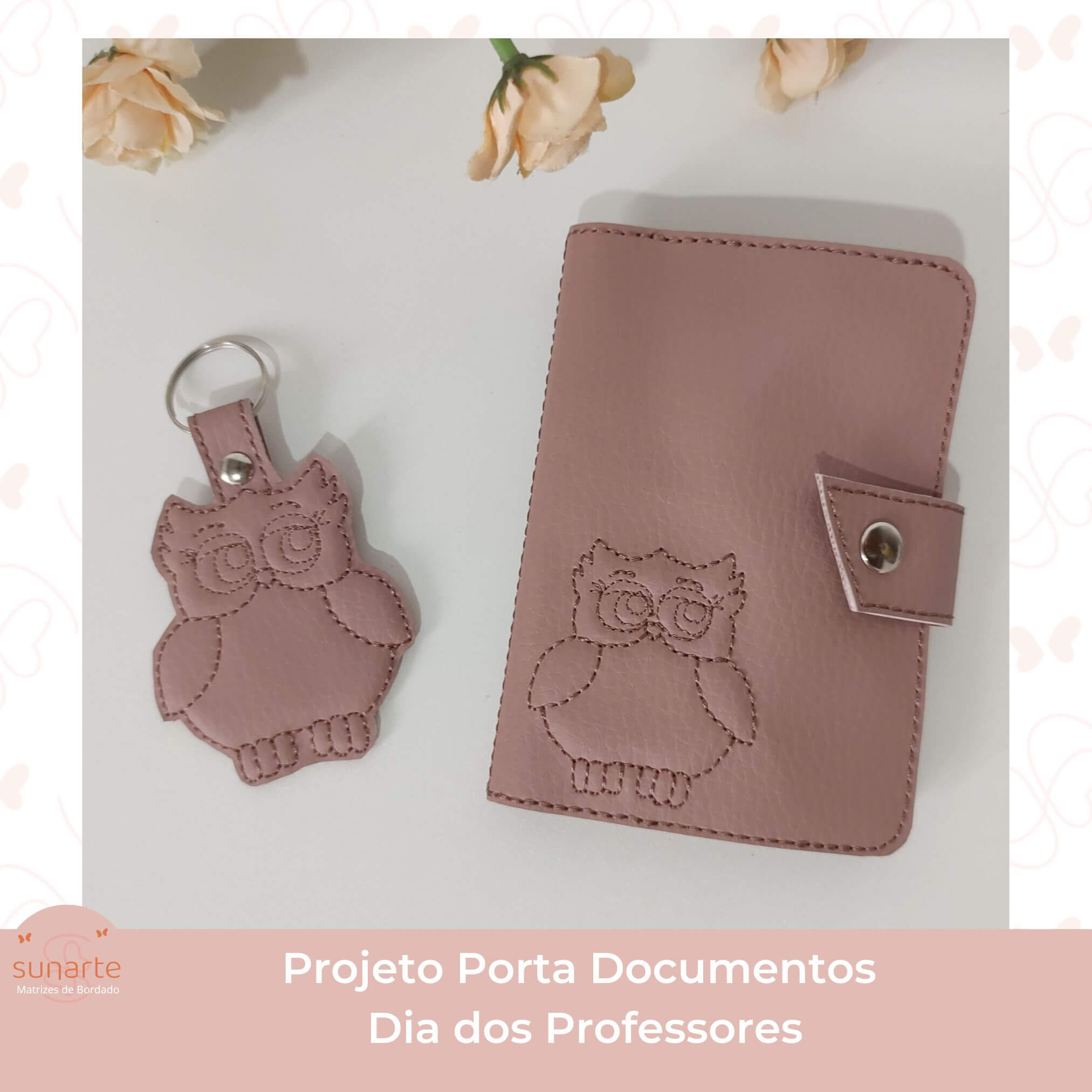 Projeto na bordadeira – Kit Dia dos Professores (Porta Documentos + Chaveiro coruja ) em sintético